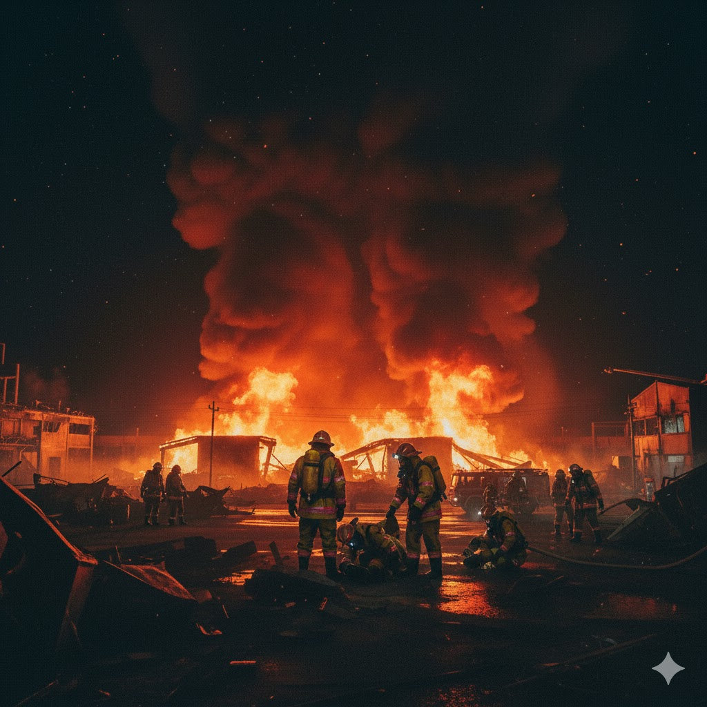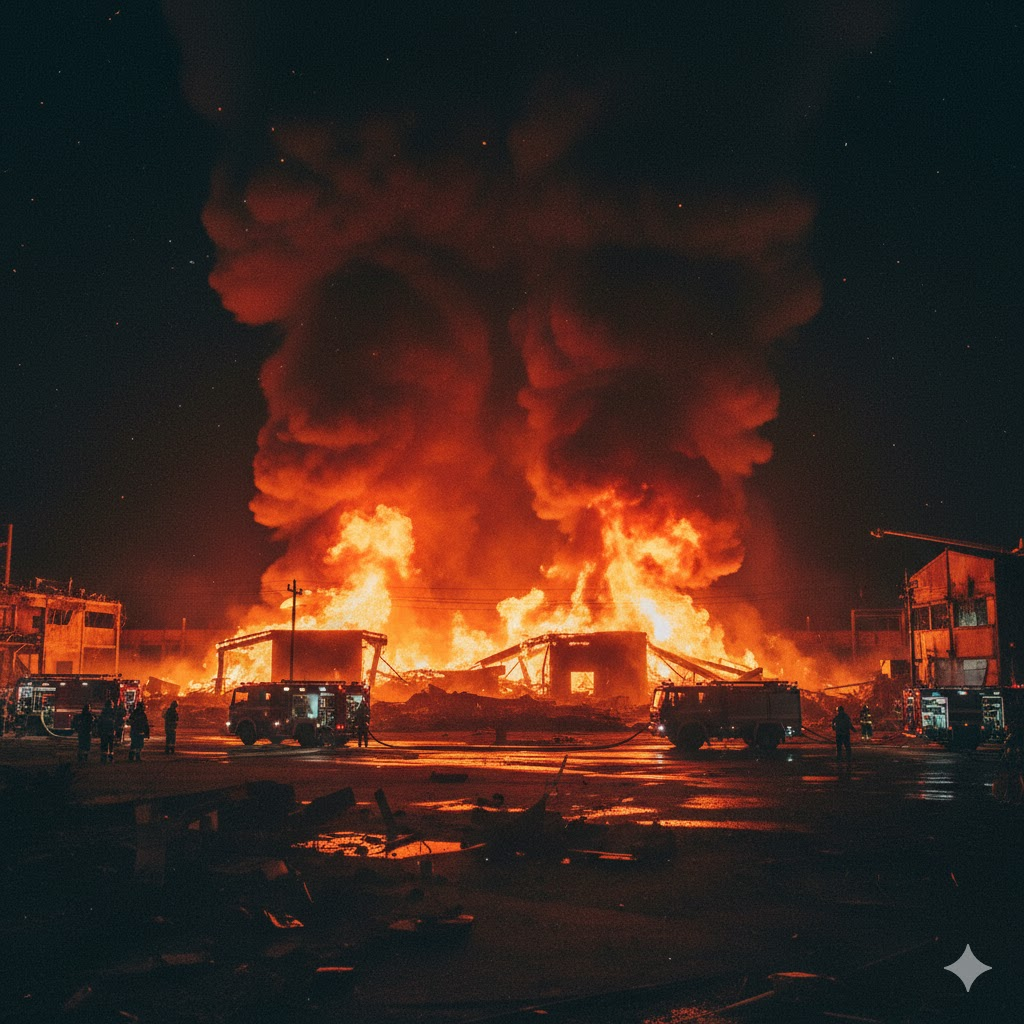 Tak lama kemudian, kobaran api besar terlihat menjulang dari area pabrik, disertai beberapa ledakan susulan yang diduga berasal dari gudang penyimpanan amunisi.